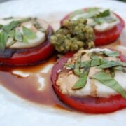 Combine all ingredients in a small food processor or mini chopper. Process until all ingredients are blended together. Leftover pesto can be stored in an air-tight container in the fridge for up to one week. In addition to capresse salad, pesto can also be used as a pasta sauce or topping for crackers (with or without a slice of cheese).